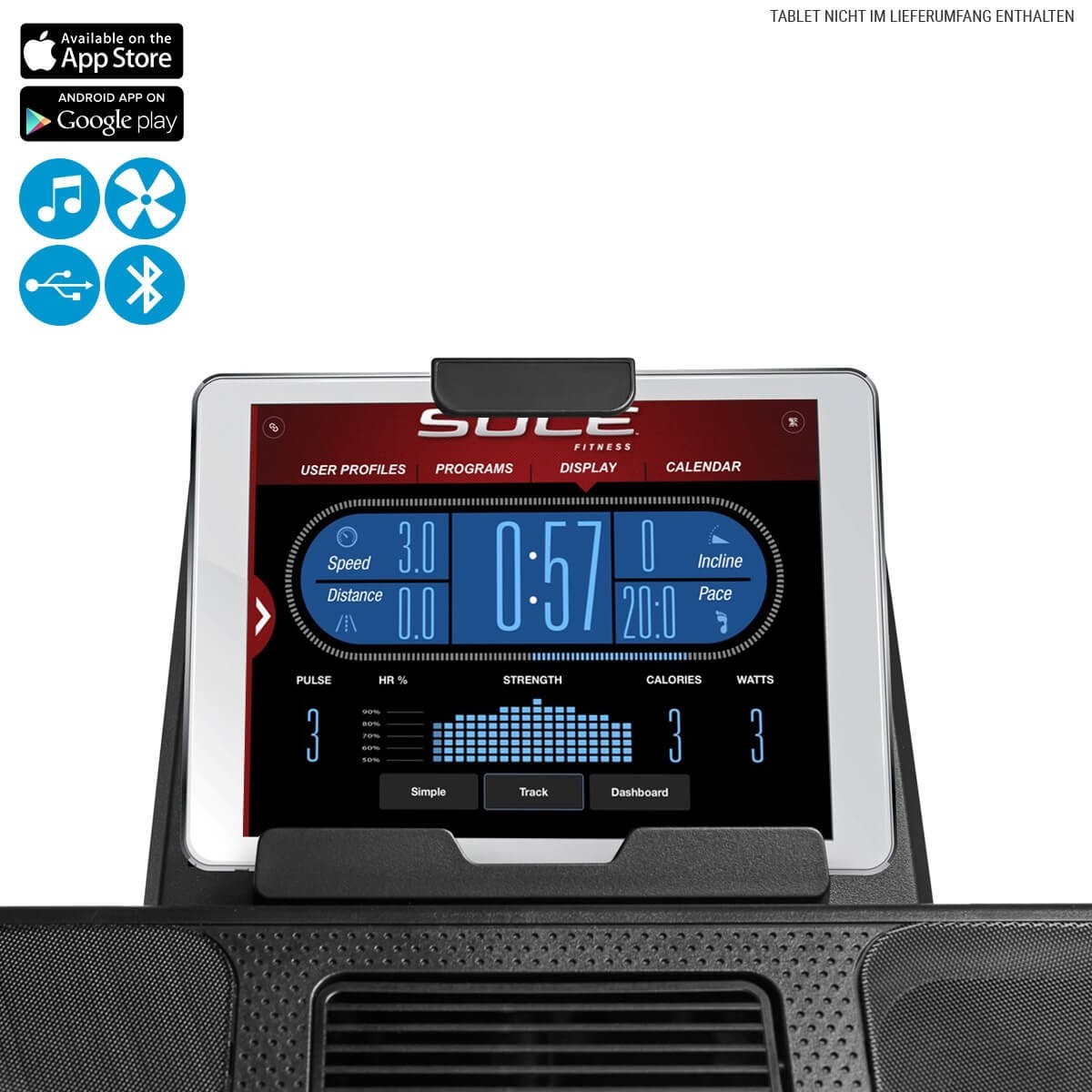 Wbudowana funkcja Bluetooth pozwala, po raz pierwszy, za pośrednictwem aplikacji SOLE Fitness połączyć się z bieżnią. Tutaj możesz sprawdzić swoje aktualne dane treningowe i regularnie je zapisywać. W ten sposób możesz osiągnąć wyznaczone cele treningowe jeszcze szybciej i bardziej efektywnie.