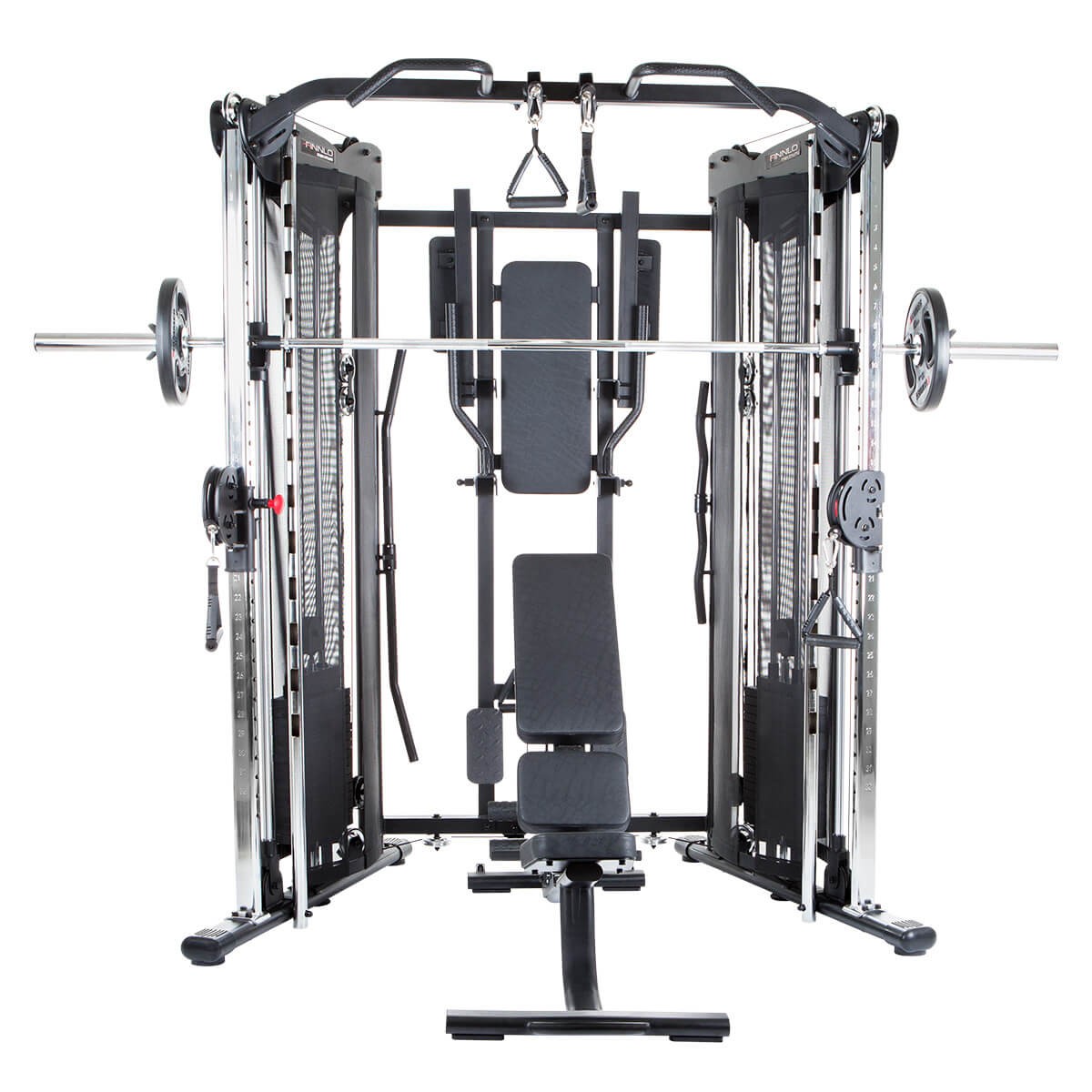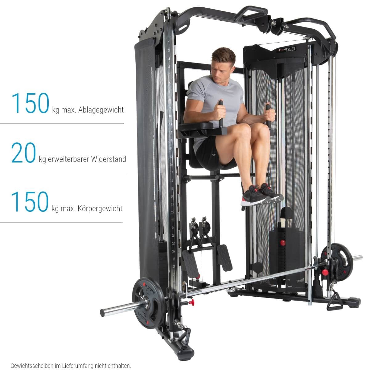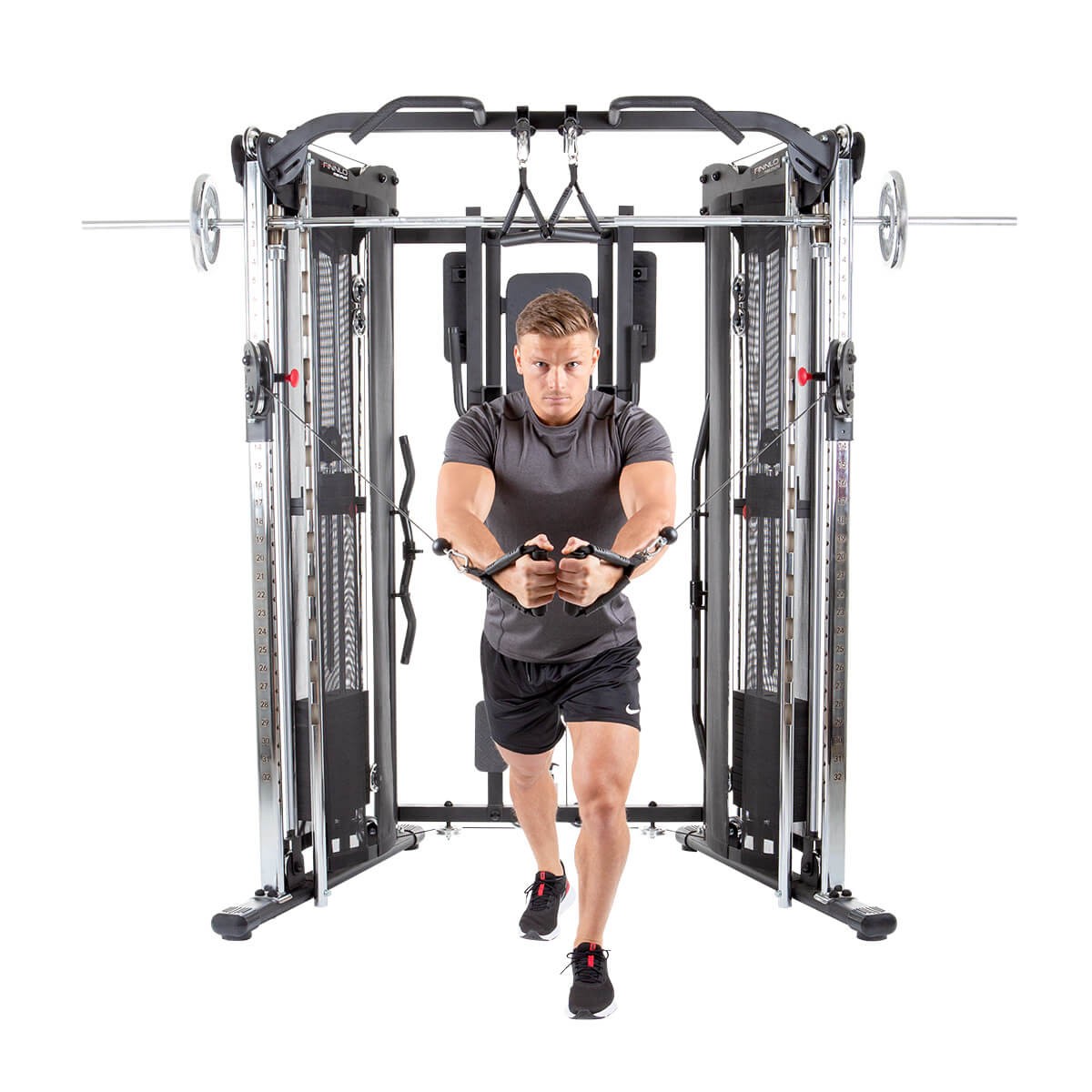 Dzięki niezależnym szynom linowym na wieżach możesz wykonywać ćwiczenia motylkowe dla wzmocnienia mięśni klatki piersiowej. Szybko można zmienić kąt treningu, aby trenować jeszcze efektywniej i aktywować nowe mięśnie. Wyciskanie z długą hantlą oferuje dodatkowe bodźce dla treningu mięśni brzucha. Długie hantle mogą być opcjonalnie dociążone (obciążniki o średnicy 30mm) lub adapterem do obciążników olimpijskich.
