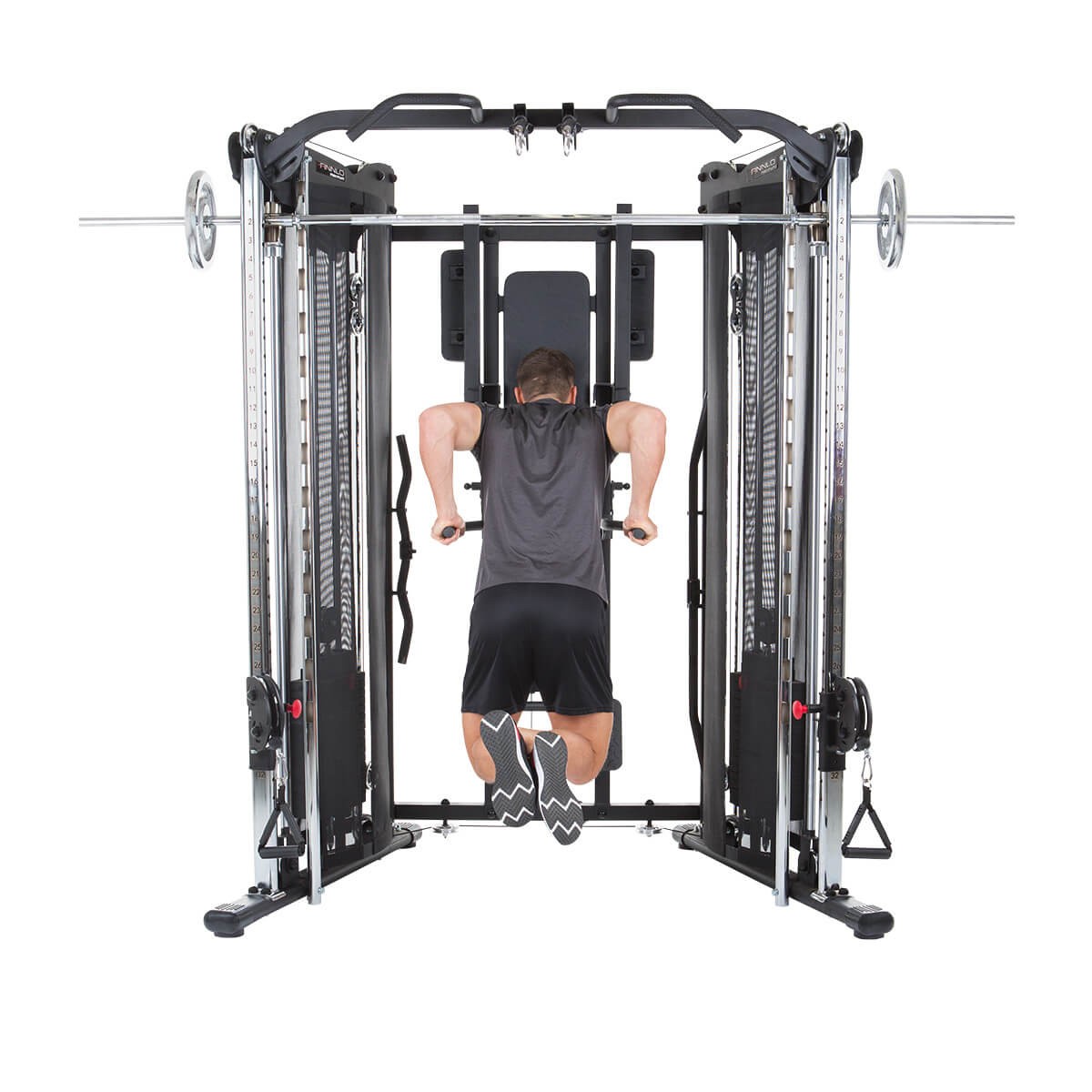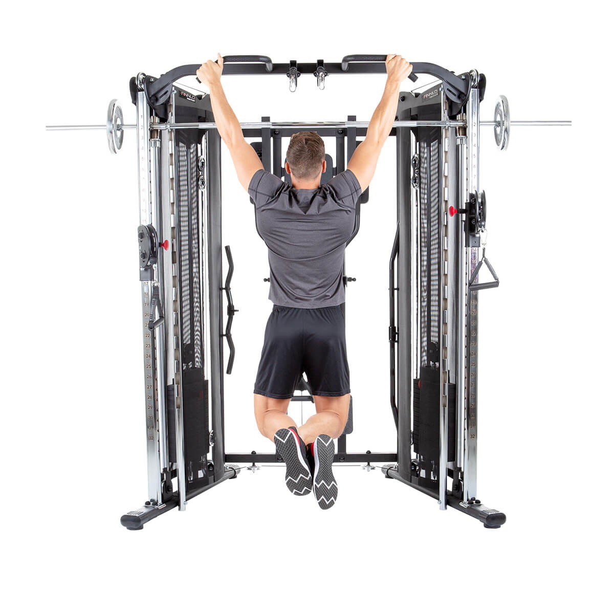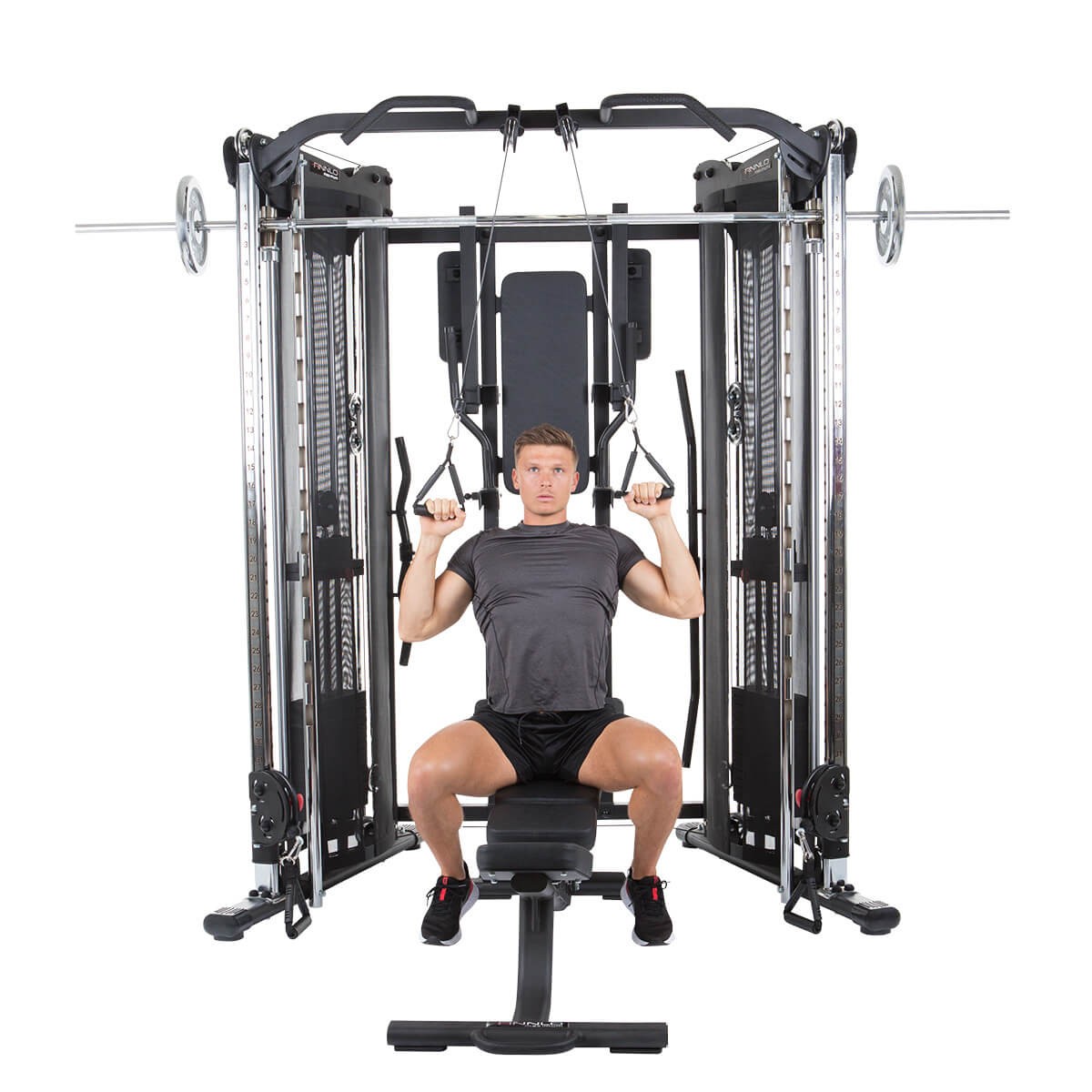 Dzięki niezależnym szynom linowym na wieżach możesz wykonywać ćwiczenia motylkowe dla wzmocnienia mięśni klatki piersiowej. Szybko można zmienić kąt treningu, aby trenować jeszcze efektywniej i aktywować nowe mięśnie. Wyciskanie z długą hantlą oferuje dodatkowe bodźce dla treningu mięśni brzucha. Długie hantle mogą być opcjonalnie dociążone (obciążniki o średnicy 30mm) lub adapterem do obciążników olimpijskich.